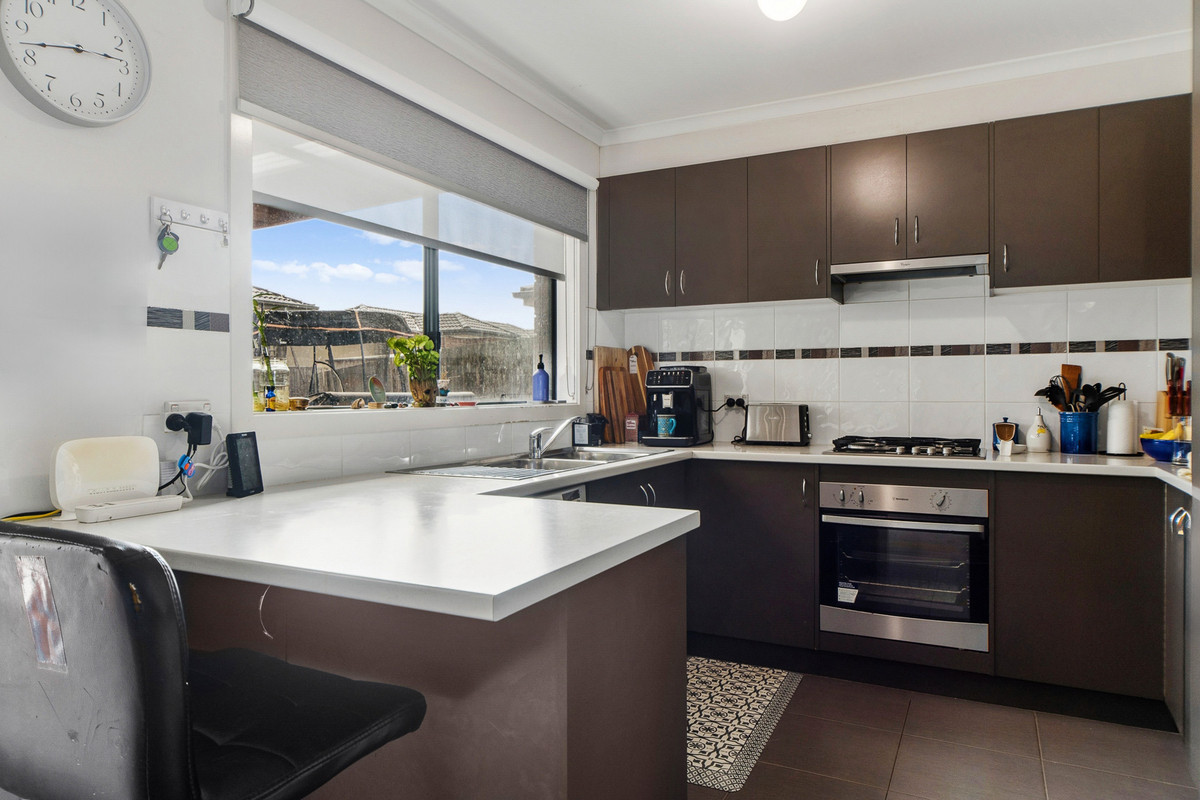 A light-filled living room forms the heart of the home, creating a welcoming setting for both relaxation and entertaining. The well-appointed kitchen is centrally positioned and equipped with ample cabinetry, a four-burner gas cooktop, and an under bench oven, seamlessly connecting to the adjoining dining area. Completing the functional layout is a dedicated laundry with convenient external access.