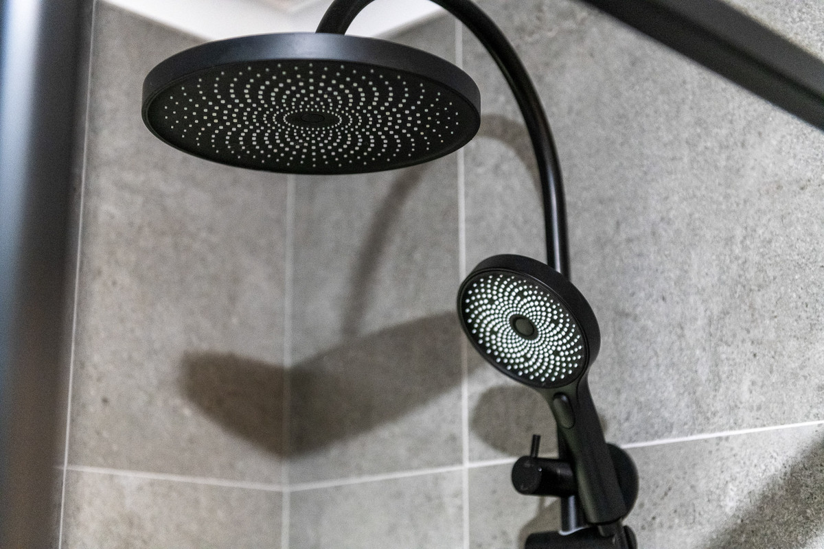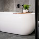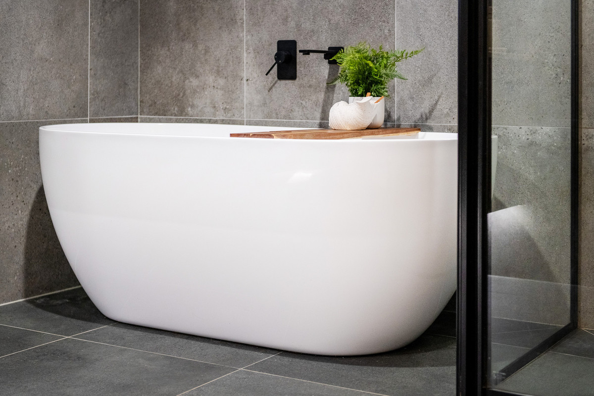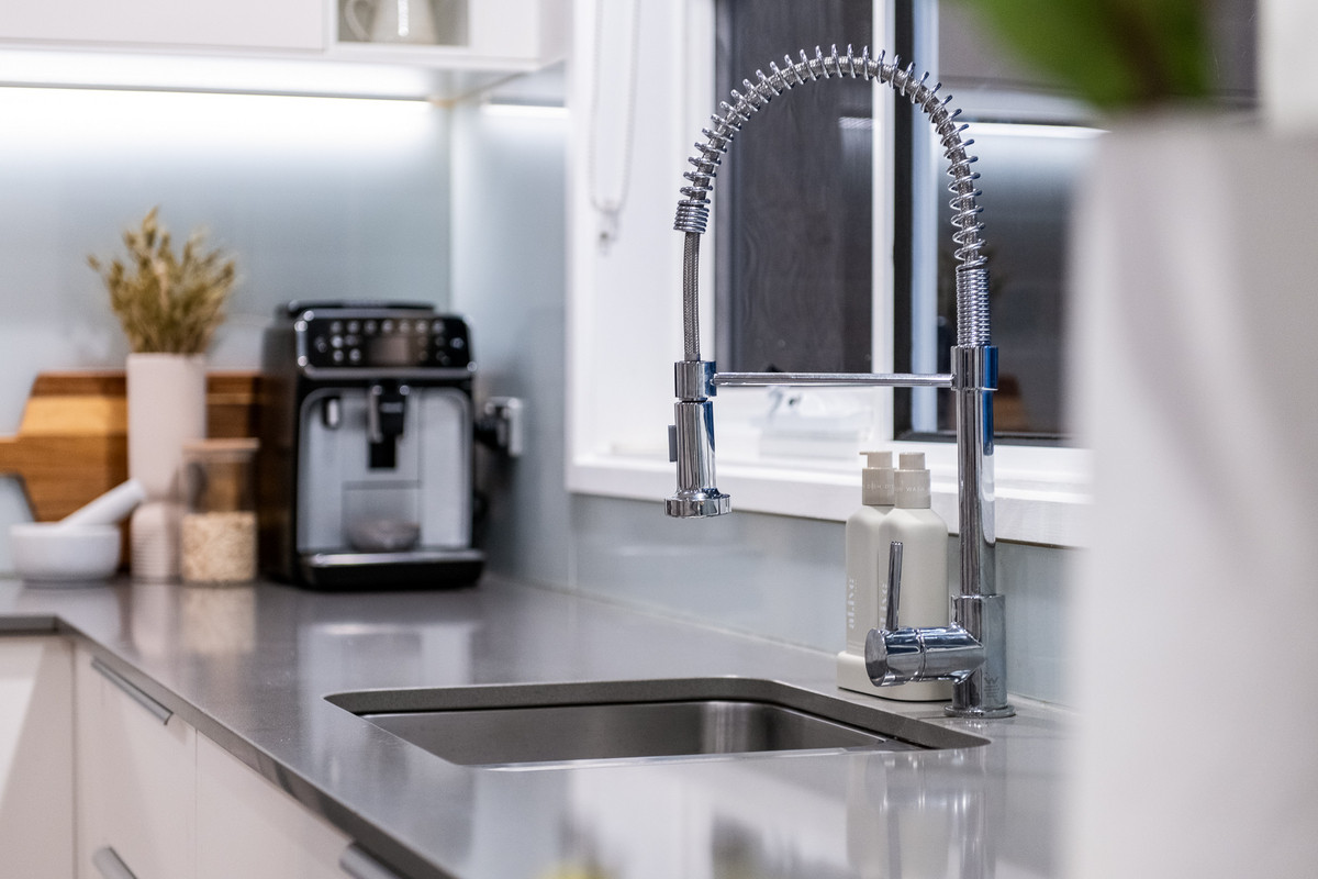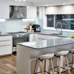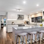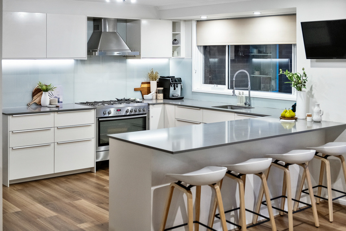 Contemporary kitchen with 900mm oven, plumbing for easy fridge connection, integrated dishwasher, and inbuilt microwave