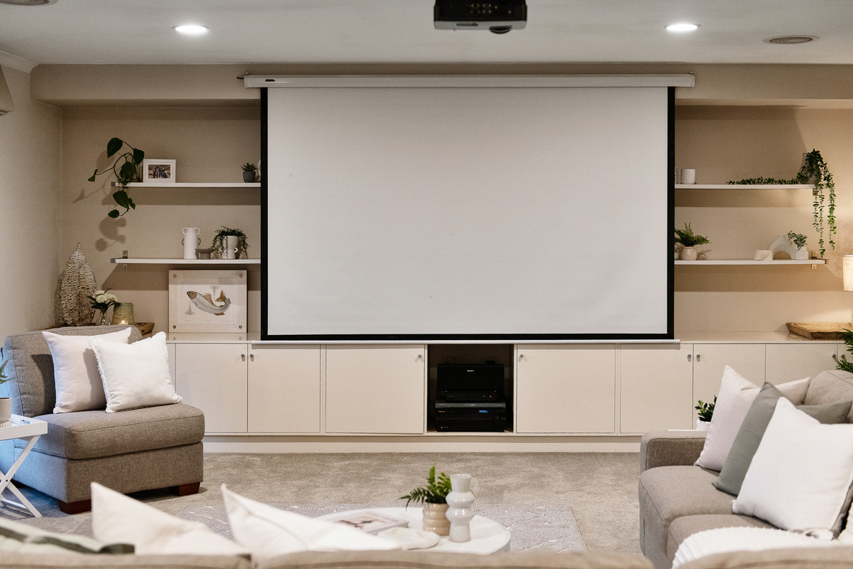 Main lounge includes projector, automatic screen, and ceiling speakers – perfect for home entertainment