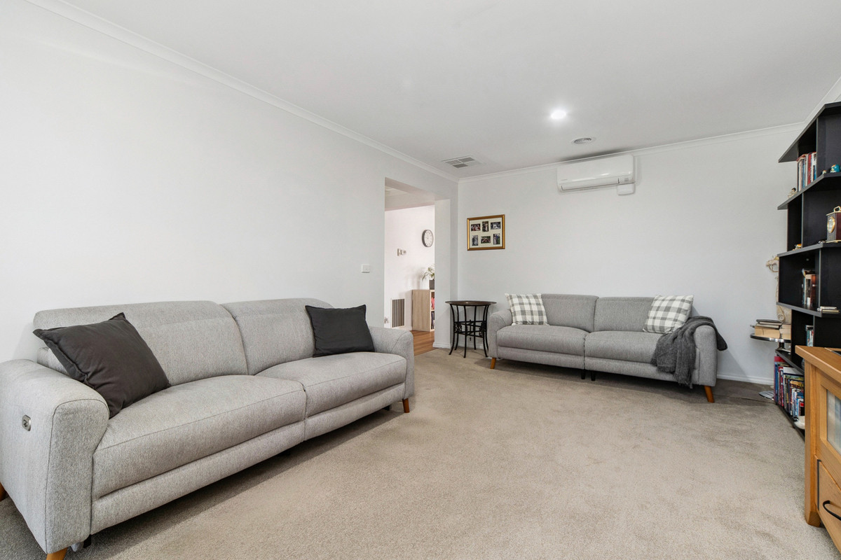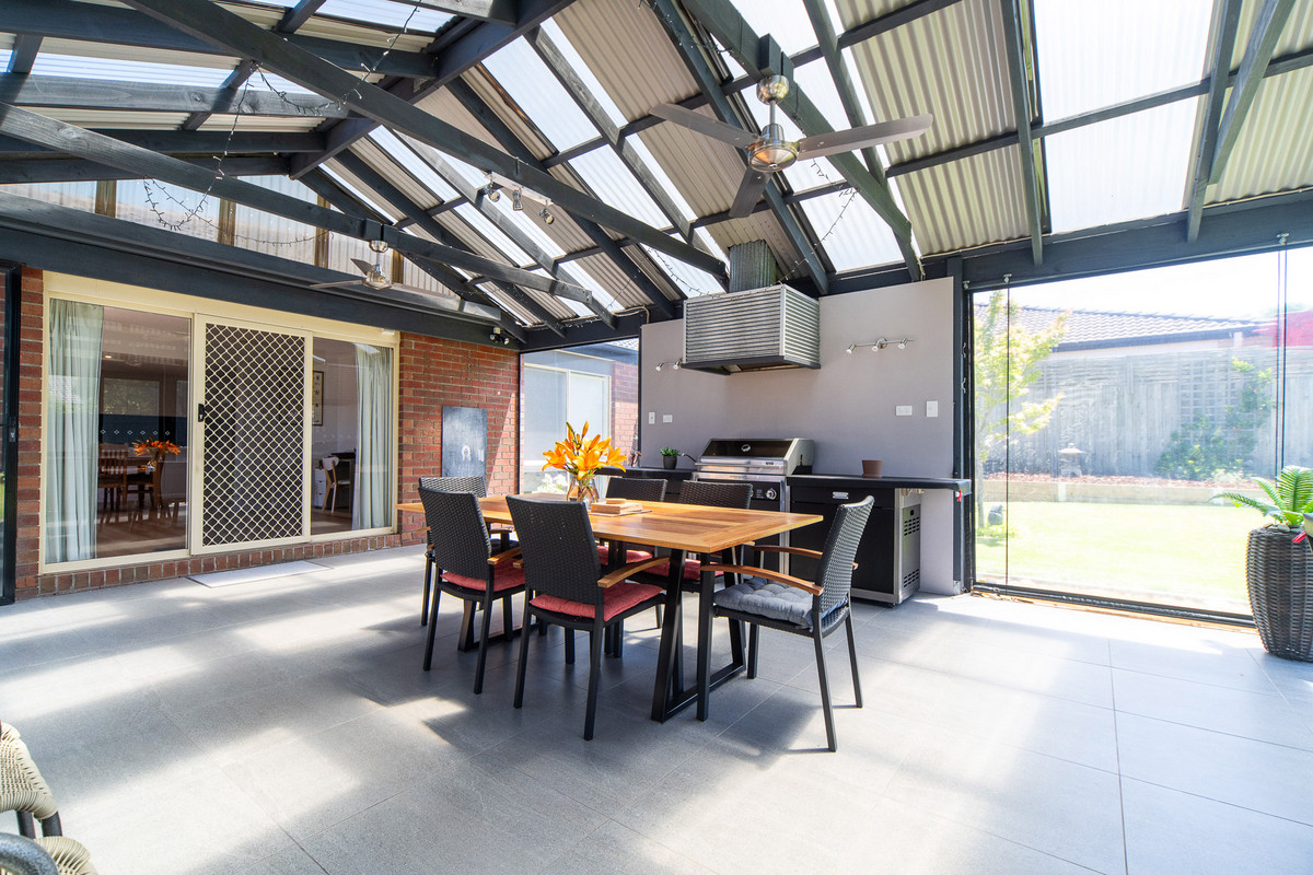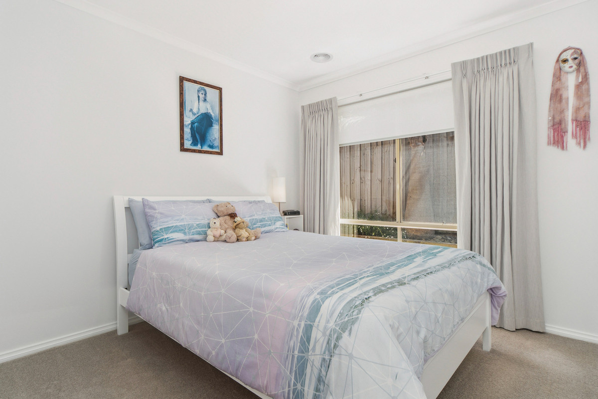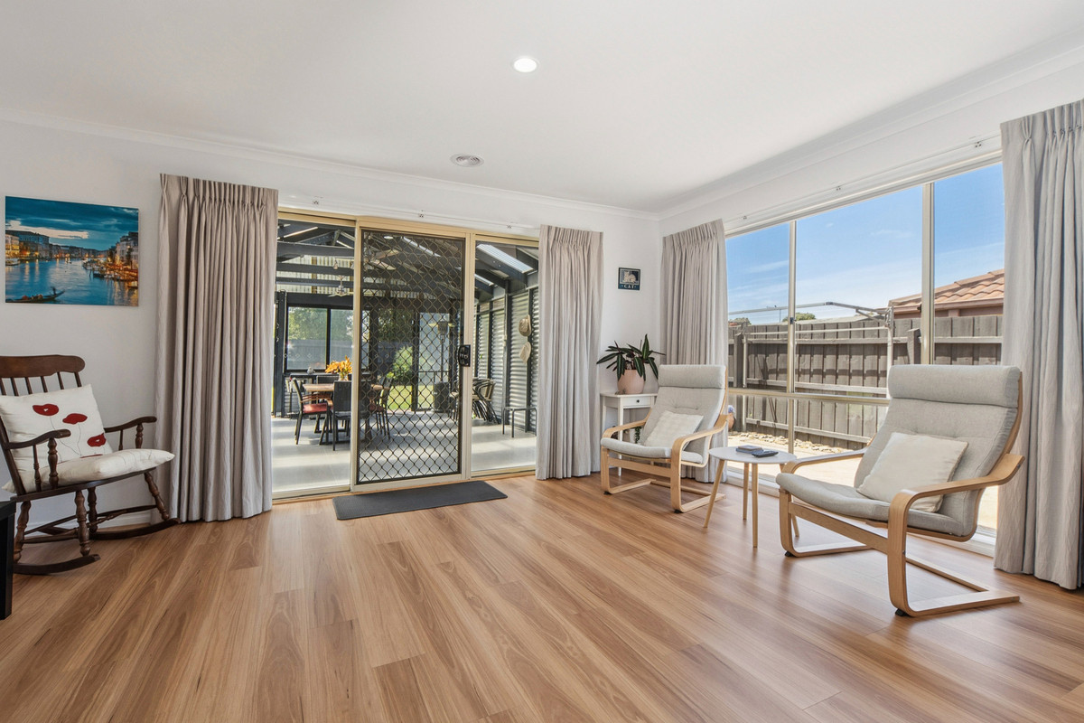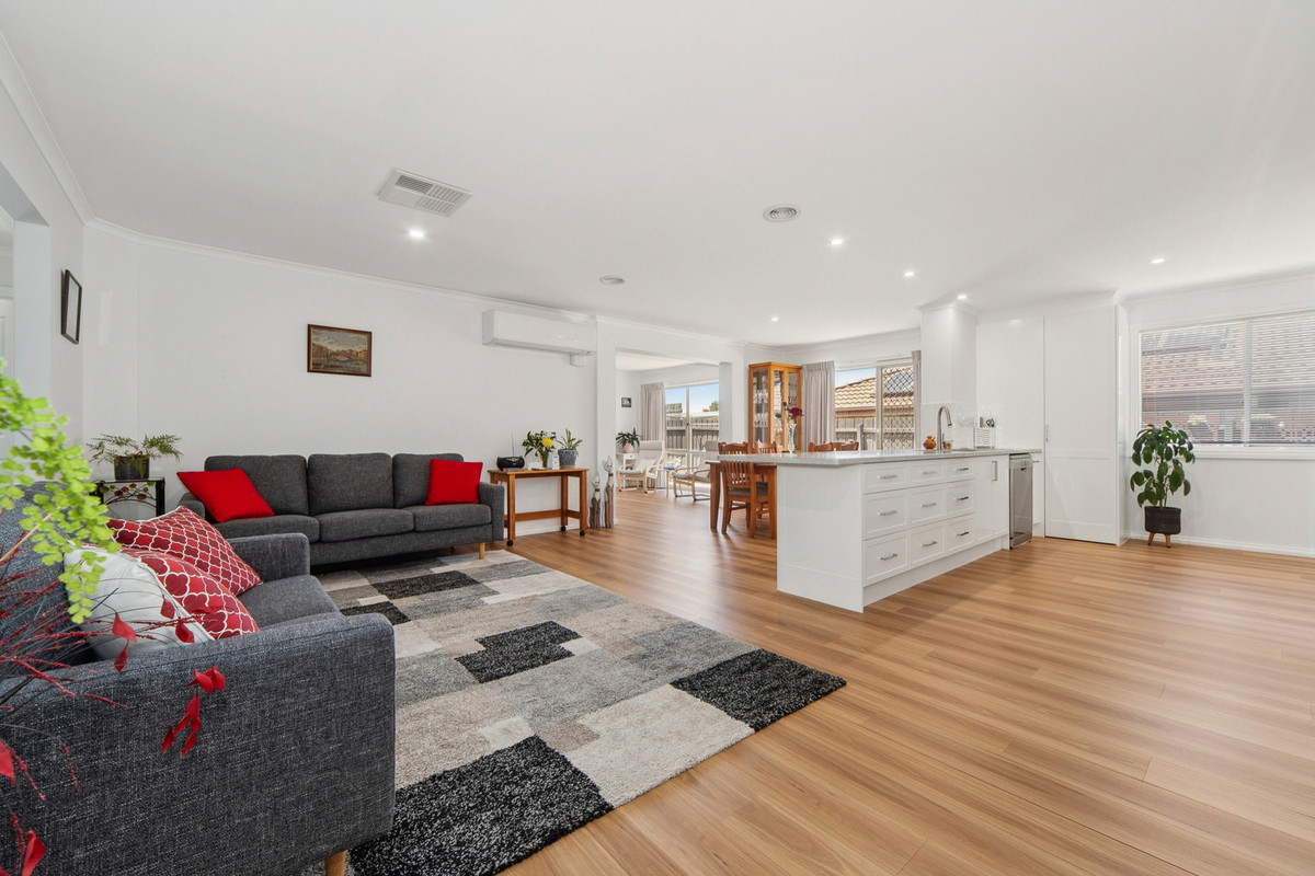 A front formal lounge sits alongside a private master bedroom, complete with renovated ensuite and comprehensive walk-through robe, before three secondary bedrooms and a main bathroom occupy a rear accommodation wing, perfect for kids. Accompanied by gas ducted heating, split-system air conditioning, and evaporative cooling, the home continues its line-up of features with established rear gardens, a double garage with drive-through access to multi-vehicle tandem parking, water tank, and multiple outdoor sheds. Set within easy reach of Carrum Downs Plaza, Flinders Christian College, public transport, and local parklands.