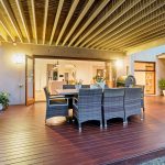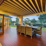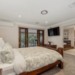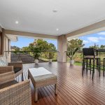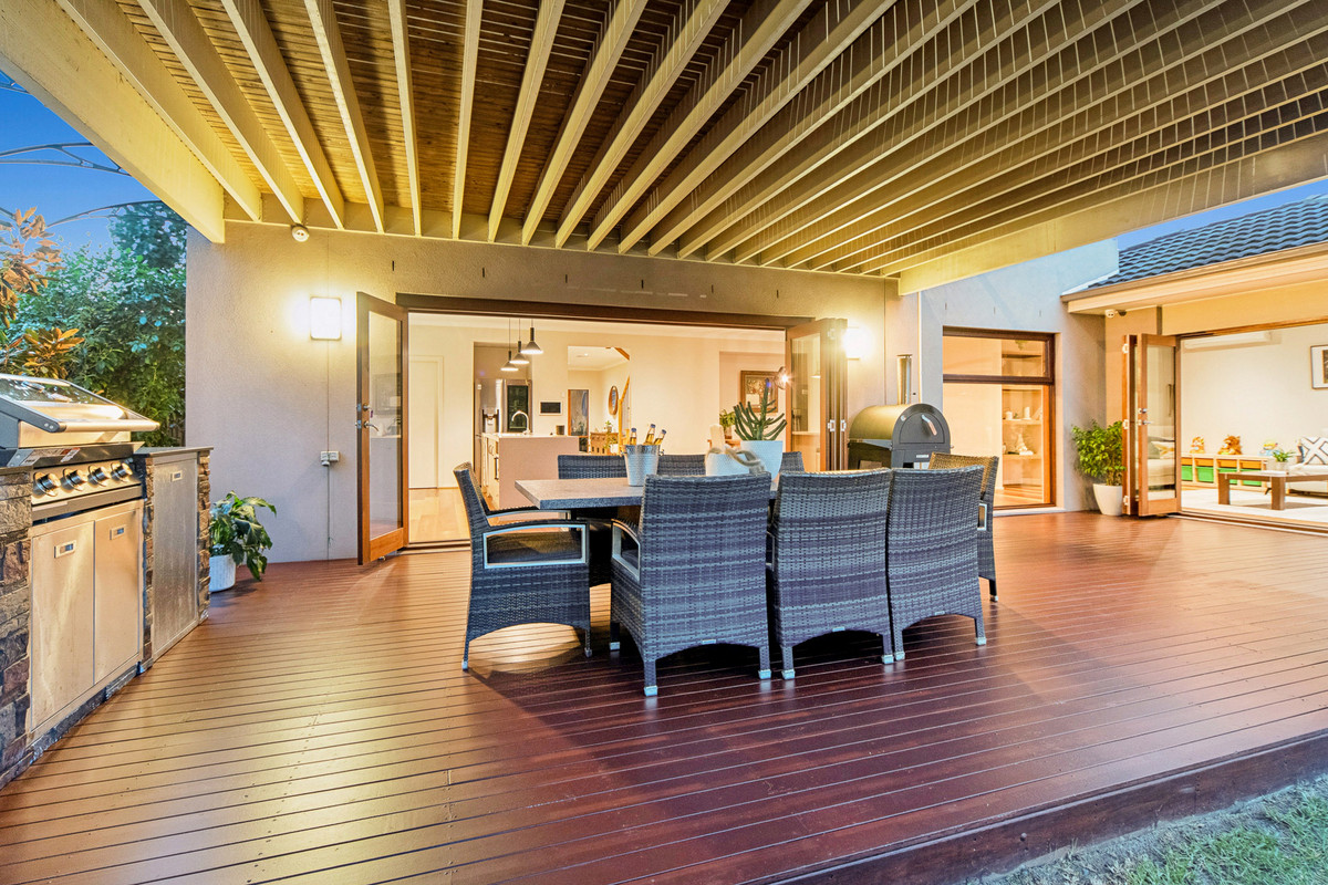 Expertly designed with high ceilings, a serene colour palette, and durable flooring that withstands the challenges of family life, the airy interior design offers a dynamic contrast to the energetic entertaining that the layout easily facilitates. Three dedicated living zones cascade across both floors, with the ground-floor social heart offering a natural axis for connection and conversation. A well-equipped kitchen featuring 900mm dual-fuel cooker, extended splashback window, butler’s pantry, and a generous island bench with breakfast bar overhang, sits alongside, with bi-fold doors taking the internal entertaining outside to a covered alfresco deck and mesmerising golf course aspects.