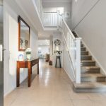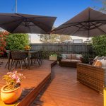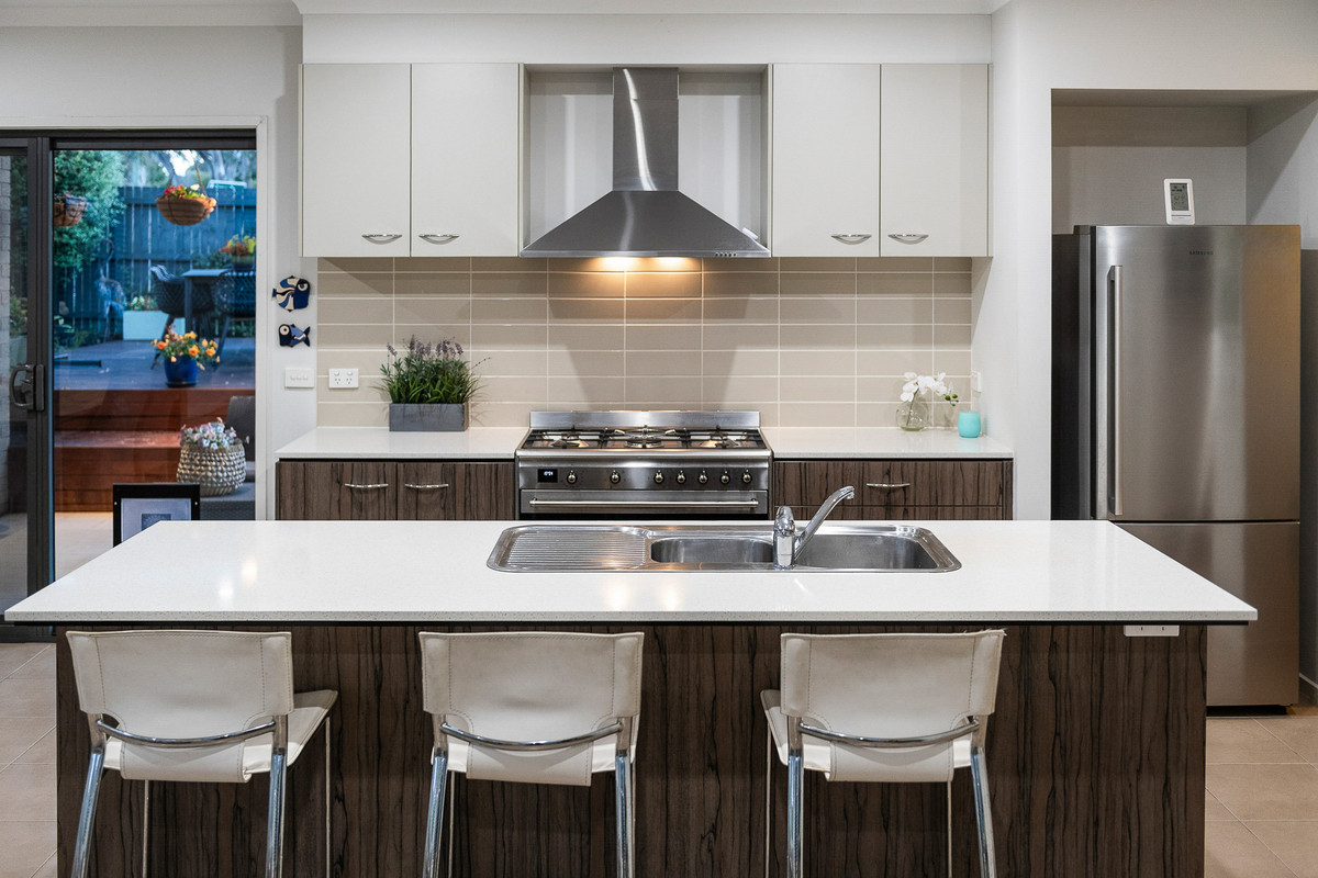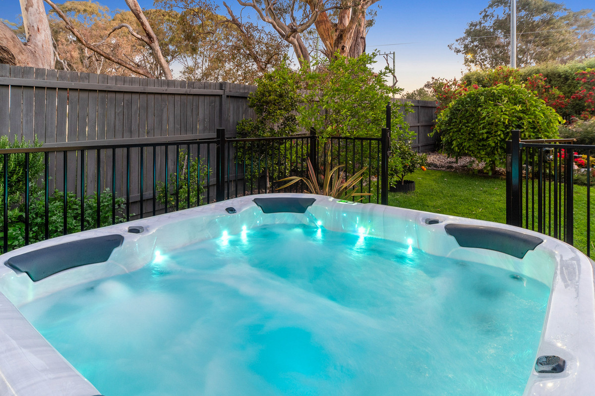 Designed to embrace natural light at every turn, the fresh interior showcases a white on white palette, playing with pops of garden colour as a ground floor entertaining domain marries lounge and dining space with a tiered entertaining deck and an above-ground spa. A central kitchen with generous walk-in pantry and Smeg dual-fuel cooker keeps hosting easy, while a first-floor lounge supports everyday family living.