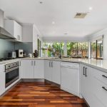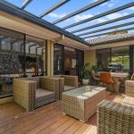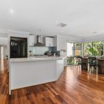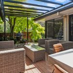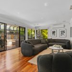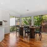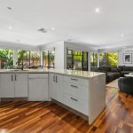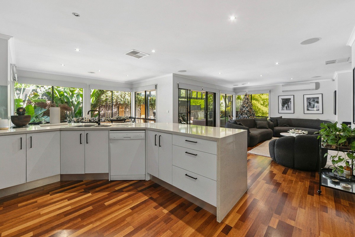 Dividing two generous living zones, a well-appointed kitchen with expansive stone benchtops and Blanco cooking appliances brings the focus centrally, before a glass-covered alfresco provides the perfect place to unwind into the evening, surrounded by lush north-facing rear gardens.