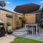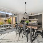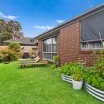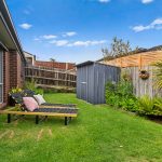 With two sun-kissed areas designed for entertaining, the practical layout flows seamlessly between living and dining, with a well-equipped kitchen buffering both zones, featuring ample cabinetry, a four-burner gas cooktop, and an underbench oven. A rear north-western orientation encourages a golden glow across a private rear yard, where a flourishing veggie garden sits amid a grassy play space and garden shed.
