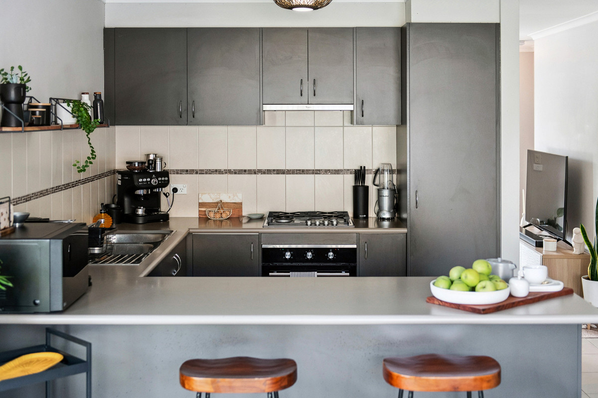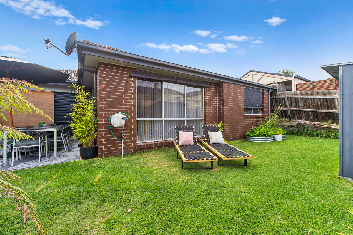With two sun-kissed areas designed for entertaining, the practical layout flows seamlessly between living and dining, with a well-equipped kitchen buffering both zones, featuring ample cabinetry, a four-burner gas cooktop, and an underbench oven. A rear north-western orientation encourages a golden glow across a private rear yard, where a flourishing veggie garden sits amid a grassy play space and garden shed.