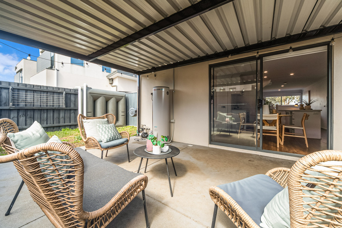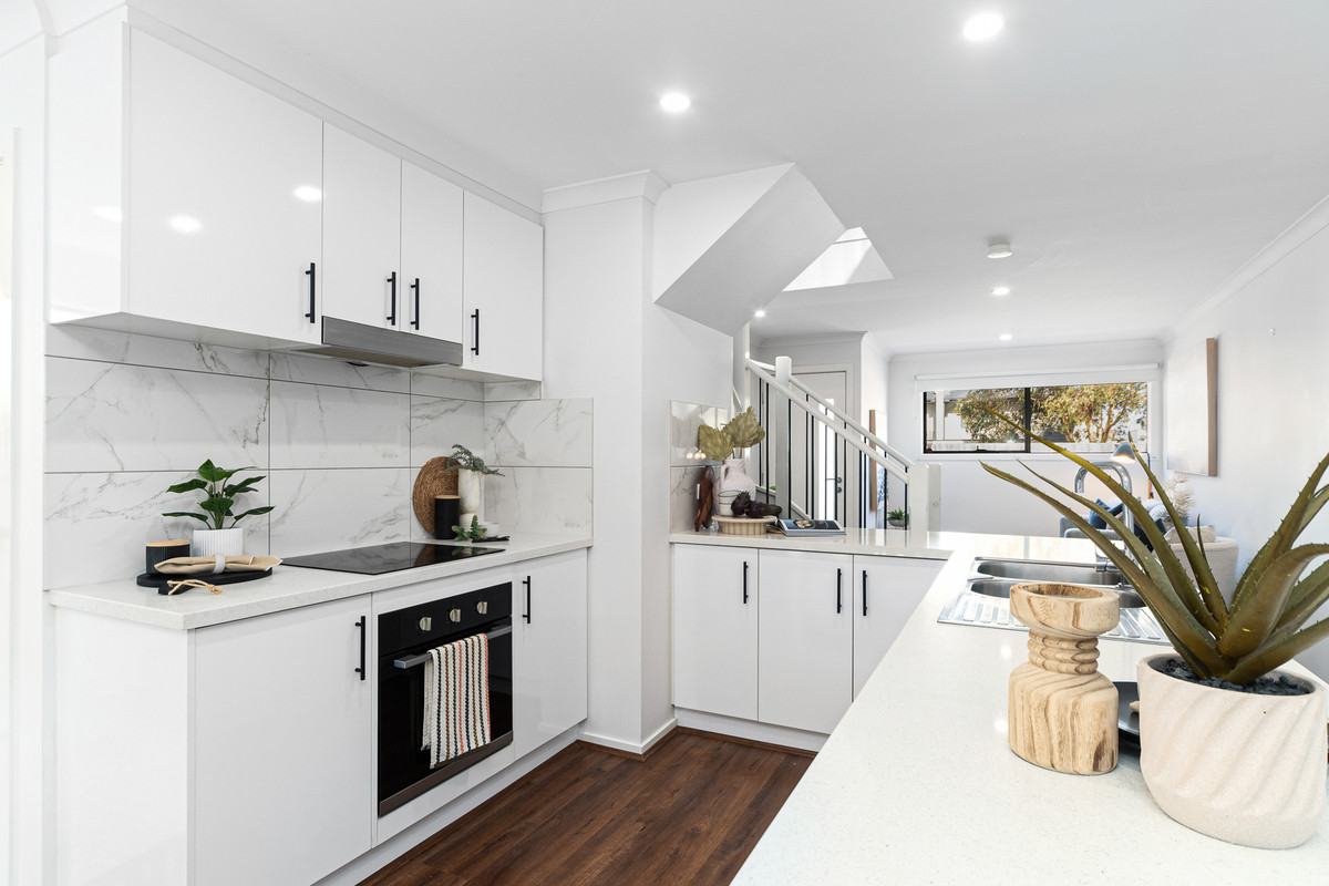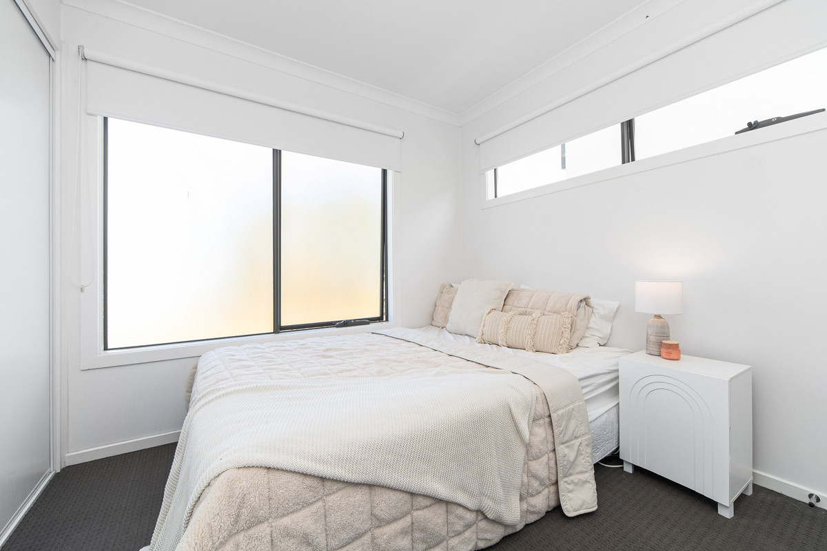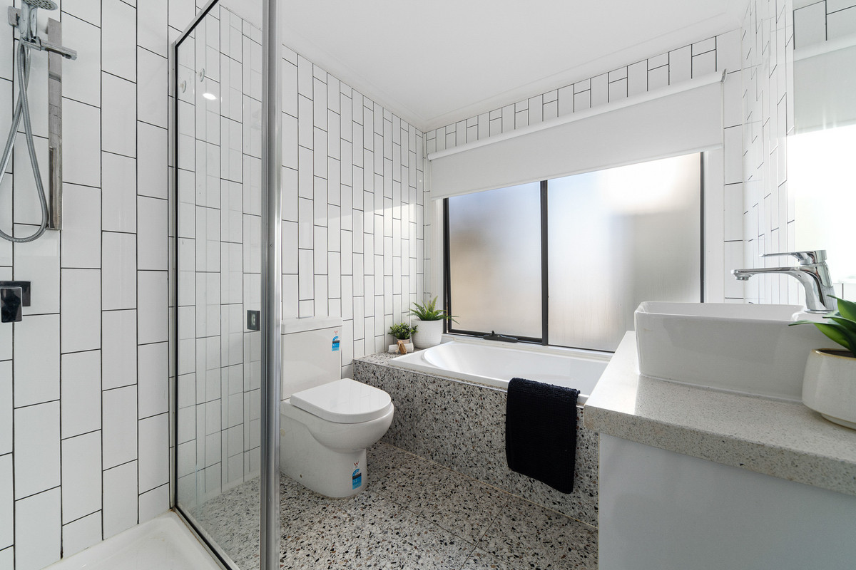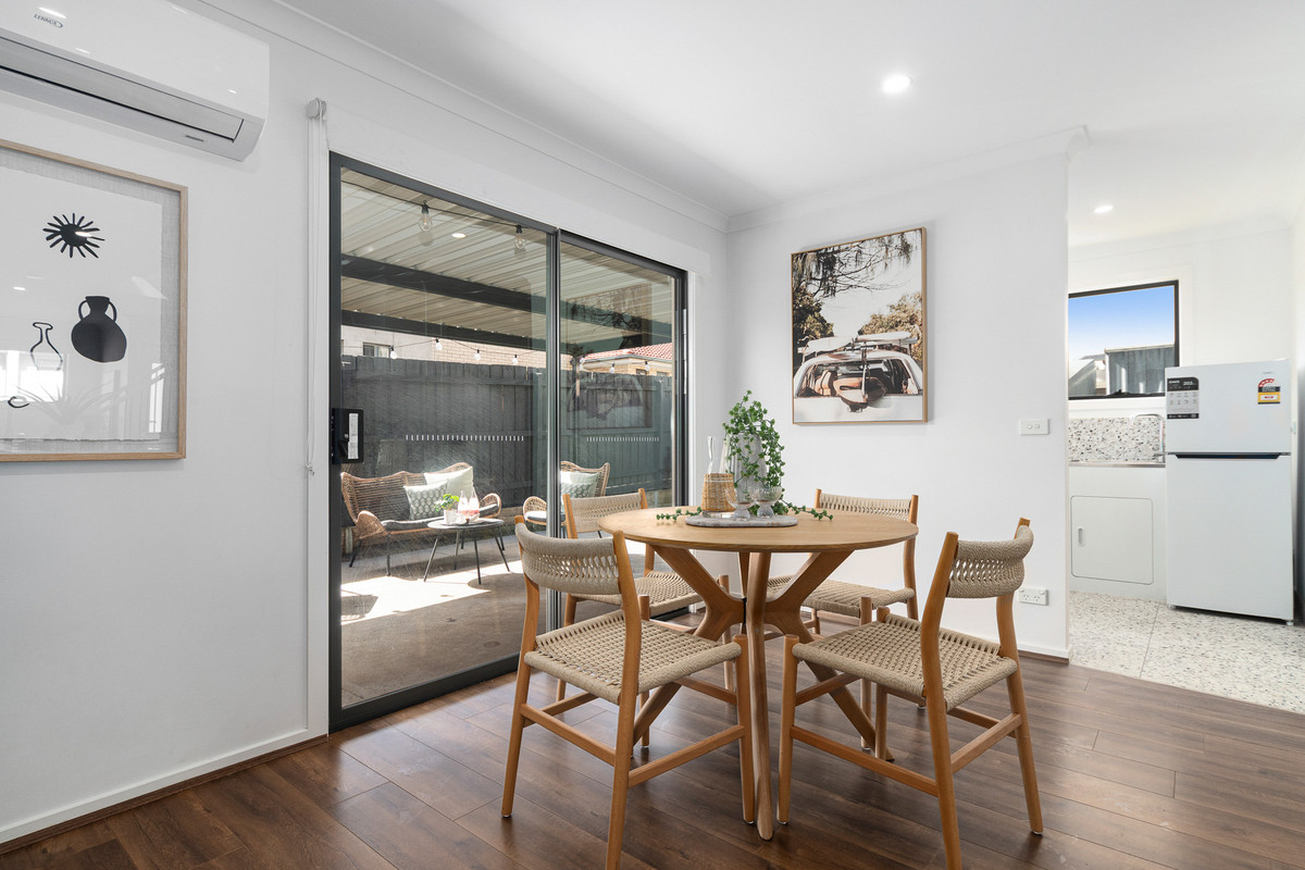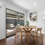 The stylish kitchen features sleek stone benchtops, premium appliances, and ample storage, while large sliding doors connect effortlessly to a spacious north-facing patio, ideal for sunny mornings or relaxed entertaining. Upstairs, the smart layout continues with two generous bedrooms, including a sun-filled master with a walk-in robe and direct access to a chic, terrazzo-inspired bathroom. Every element has been carefully considered, from the full-sized laundry and guest powder room to three split-system air conditioners, LED downlights, and internal access from the secure single garage, offering comfort and convenience at every turn.