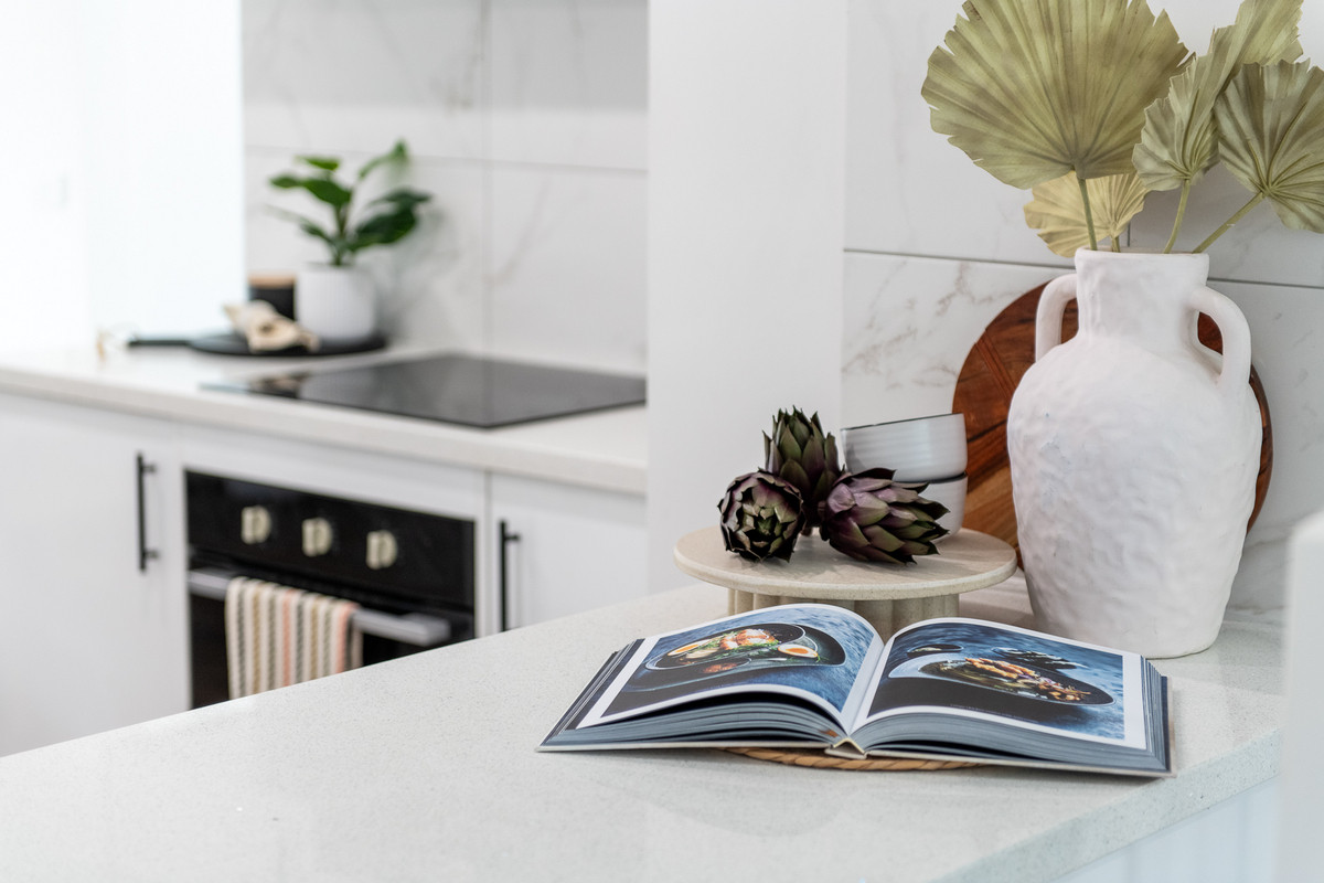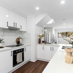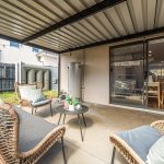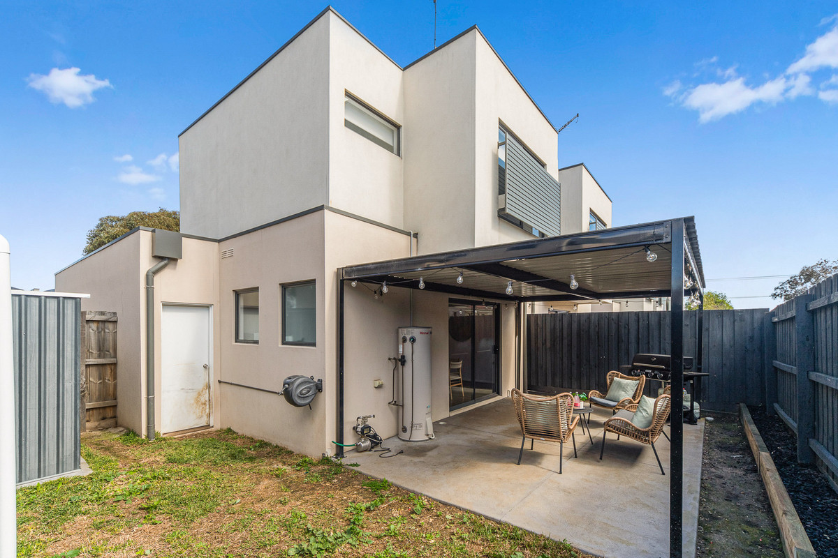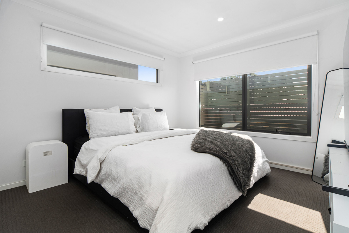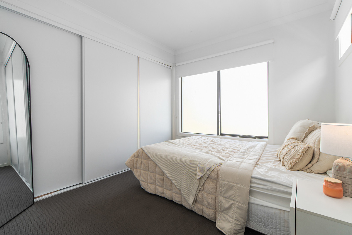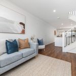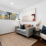 The stylish kitchen features sleek stone benchtops, premium appliances, and ample storage, while large sliding doors connect effortlessly to a spacious north-facing patio, ideal for sunny mornings or relaxed entertaining. Upstairs, the smart layout continues with two generous bedrooms, including a sun-filled master with a walk-in robe and direct access to a chic, terrazzo-inspired bathroom. Every element has been carefully considered, from the full-sized laundry and guest powder room to three split-system air conditioners, LED downlights, and internal access from the secure single garage, offering comfort and convenience at every turn.
