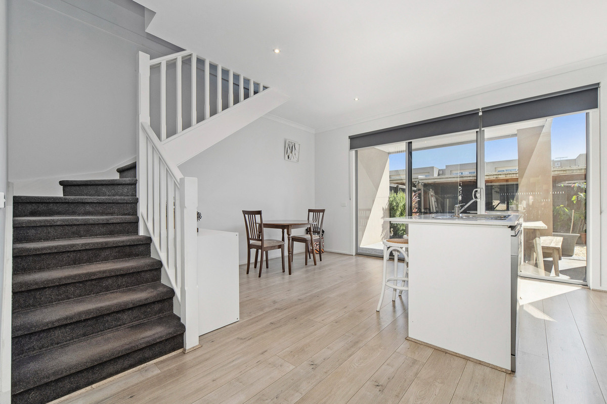 Simple sophistication shines inside, with open entertaining the focus of the ground floor. Sharing in elevated ceiling heights, a dedicated lounge with split-system heating and cooling unit stretches to both a bright dining space and wellappointed kitchen, where stainless steel appliances and an island bench with breakfast bar overhang provide practical facilities for the home cook. A step outside keeps entertaining alive under a cover alfresco, while low-maintenance gardens soften direct access to the double garage (accessed via rear laneway).