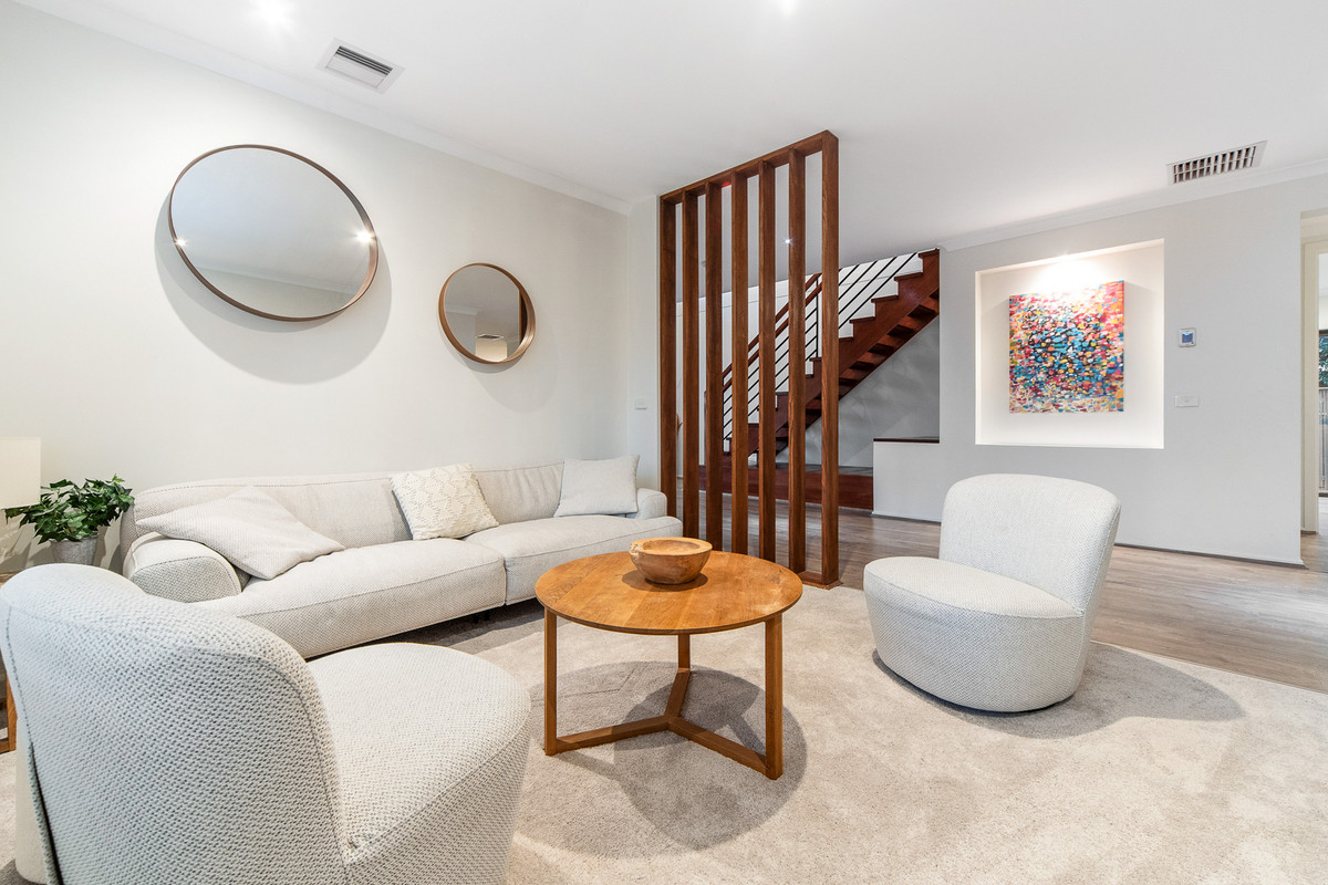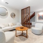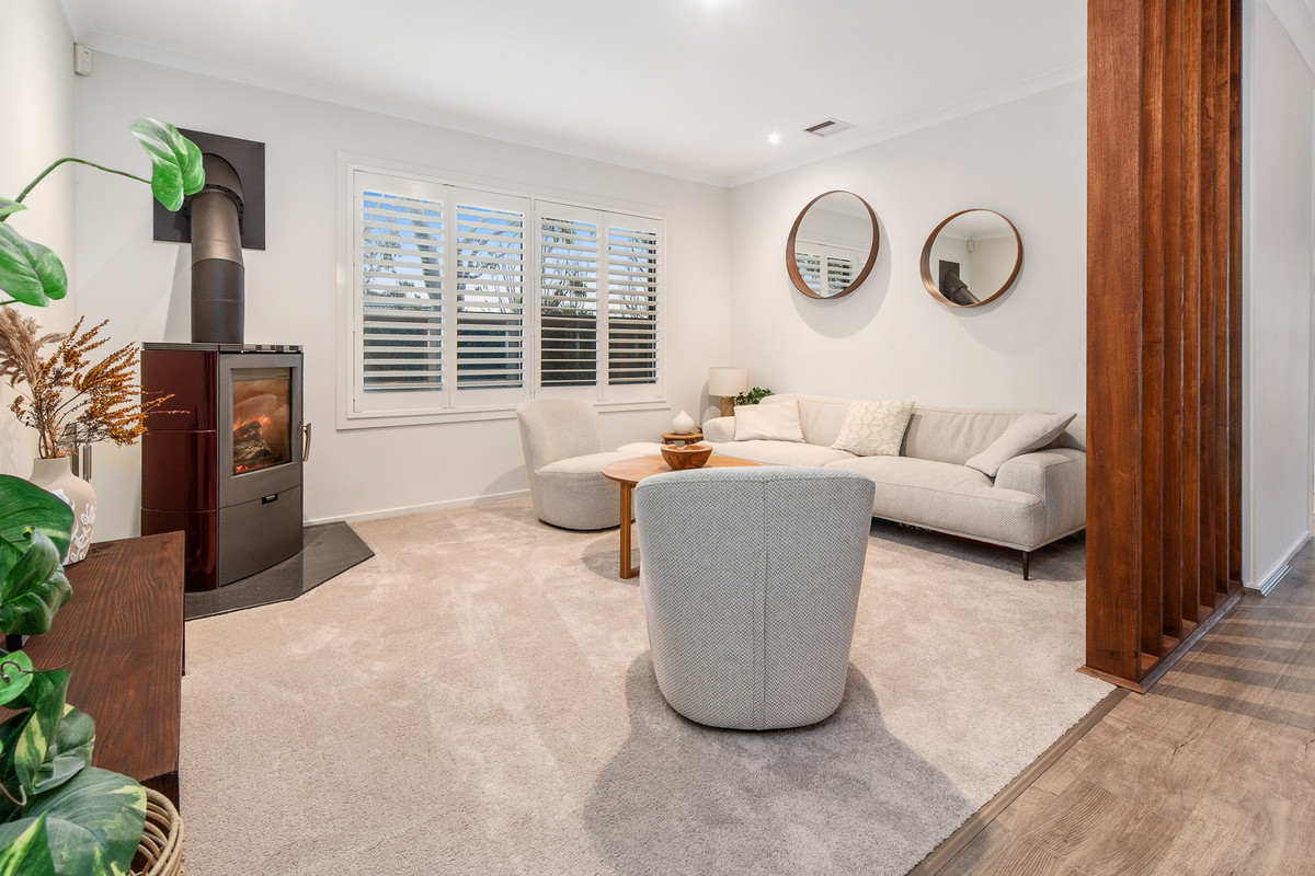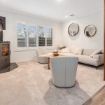 Bathed in natural light, the ground floor effortlessly brings families together across its thoughtfully designed living and dining areas, each infused with its own unique character, including a freestanding wood heater, vertical timber panelling, and eye-level highlight window that invite the outdoors in. A true chef’s kitchen completes the picture, alongside a